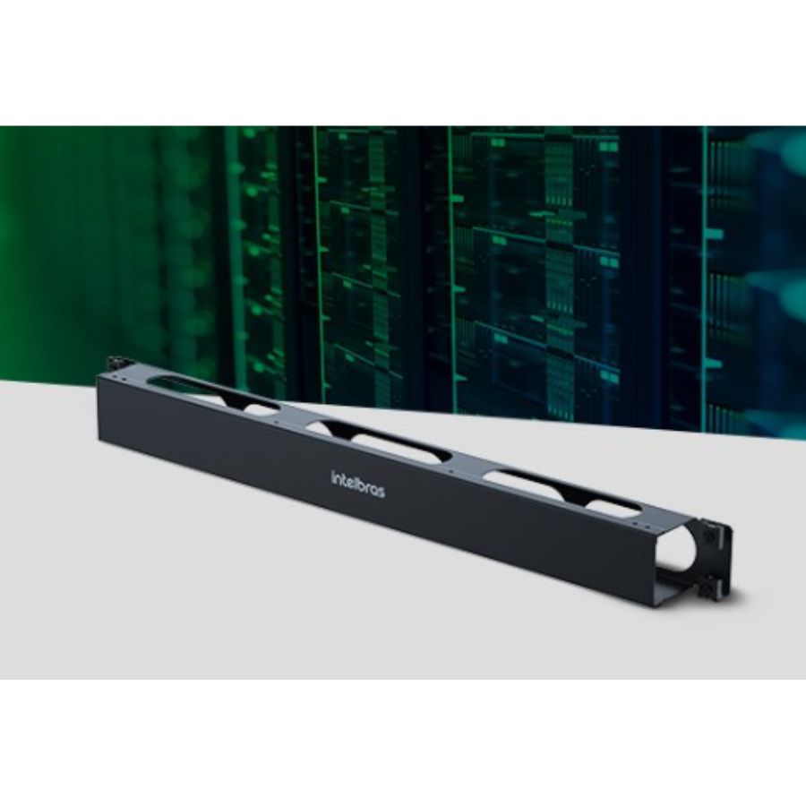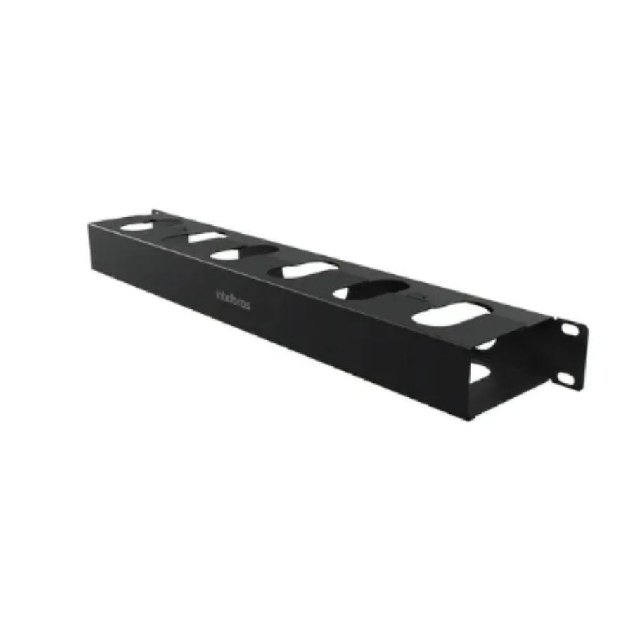 É um organizador de cabos horizontal, para uso em racks de 19 polegadas, com altura de 1U.